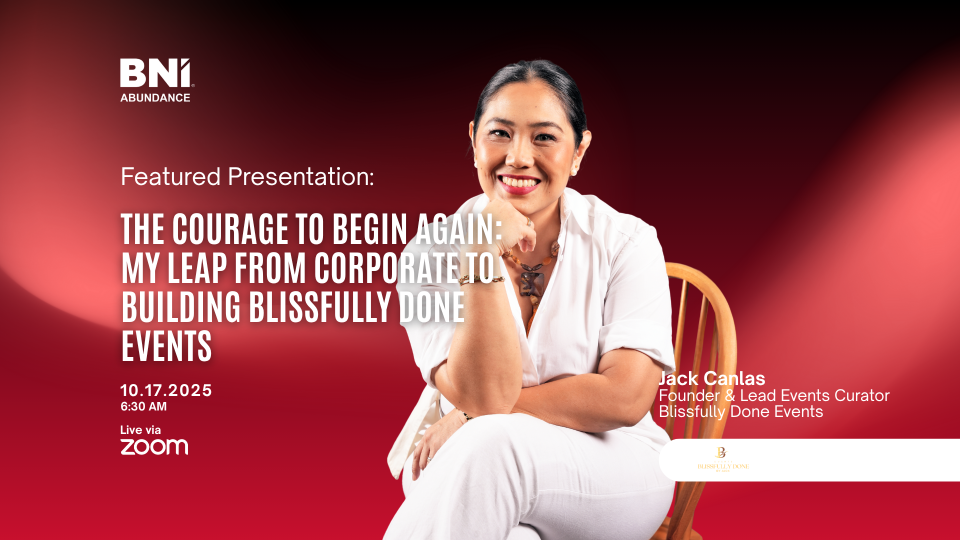 Join us this Friday at 6:30 AM as Jack Canlas, Founder and Lead Event Curator of Blissfully Done Events, shares her inspiring story in her Feature Presentation: